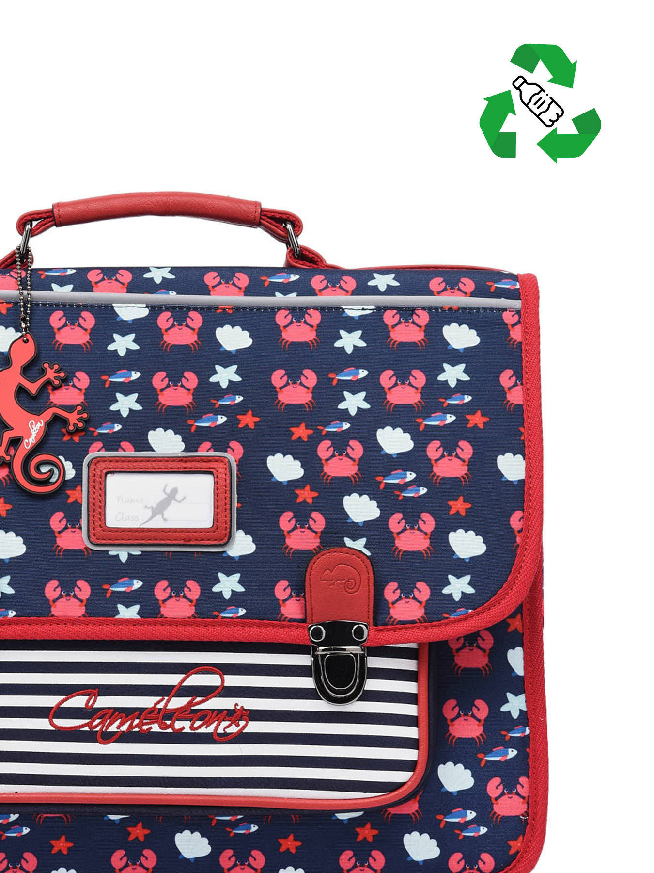 35 cm - 13 litres - 0.89 kg ~ Cartable enfant 35cm de la ligne Retro signé Caméléon, idéal pour la maternelle ou le CP. Ce cartable enfant se divise en 2 compartiments pouvant contenir les formats cahiers 21x29,7 cm et 24x32 cm. On retrouve à l'intérieur du cartable enfant un emplacement spécial règle et une poche zippée centrale. La poche avant simple est parfaite pour y glisser le goûter. Conçu pour le confort des enfants, le dos et les bretelles de ce cartable 35cm sont renforcés. Fabriqué à partir de polyester recyclé imperméable. Enfin, côté sécurité, des bandes réfléchissantes sont prévues autour du sac. Petit plus, un emplacement pour la gourde est situé sur le côté du cartable. Une règle est offerte dans ce cartable !