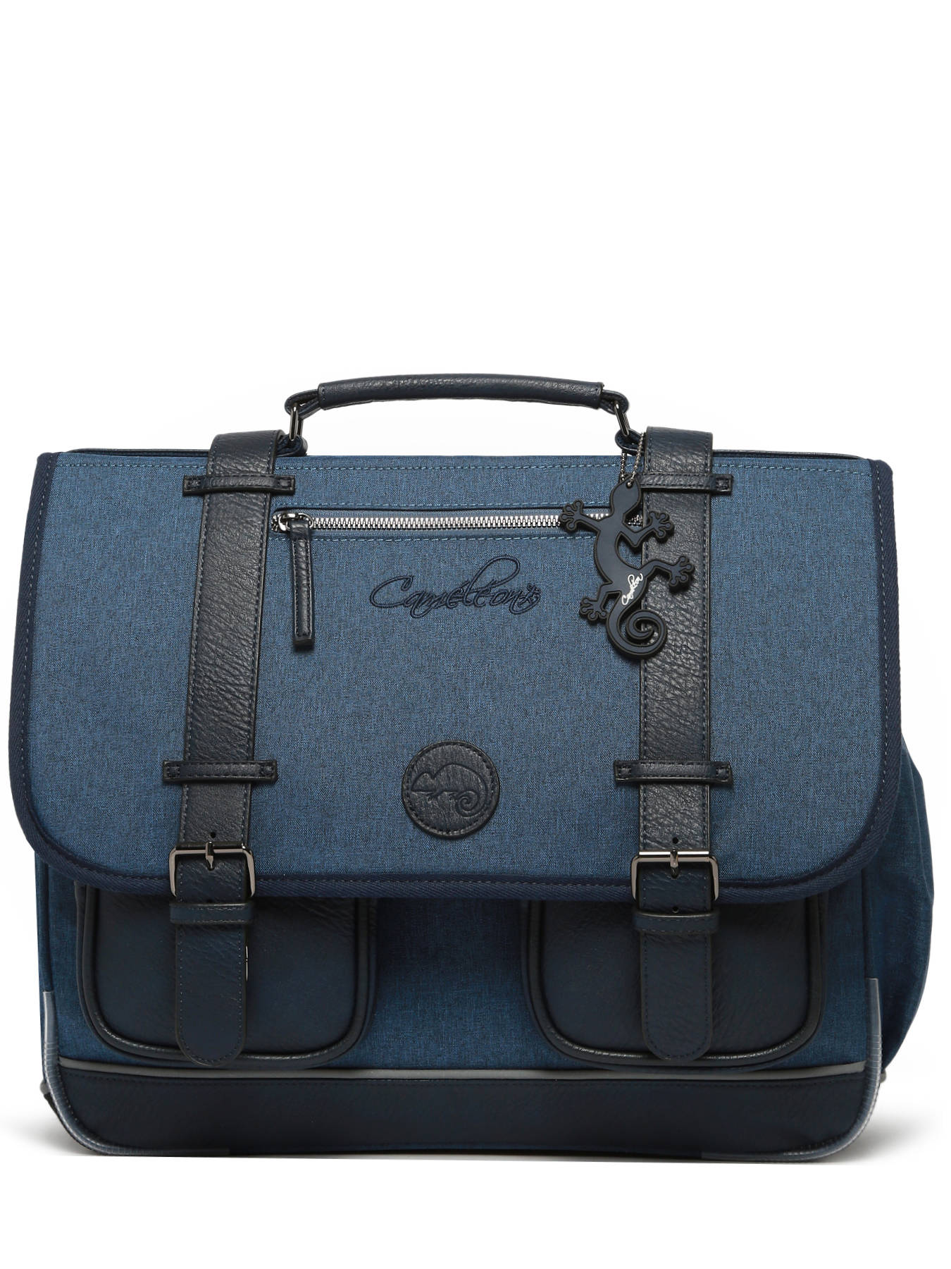 41 cm - 24 litres - 1.33 kg ~ Cartable trois compartiments de chez Caméléon, très résistant et confortable. Très beau cartable signé Caméléon de la ligne Vintage Color, convient parfaitement pour le CM1 et le CM2. Il se divise en trois grands compartiments pour l'ensemble des affaires d'école et possède une vaste poche centrale zippée. Fonctionnel, ce cartable 41cm dispose d'une petite poche zippée, d'un emplacement spécial règle. L'extérieur du cartable est doté de deux poches à fermeture éclair sur le devant du cartable et une sur le rabat. Ergonomique, la poignée et le fond du cartable sont renforcés. Très confortable, le dos et les bretelles sont rembourrés. Ce cartable est fabriqué en polyester et résistera à l'eau. Petit plus, la règle est offerte et une poche extérieure pour la gourde est présente sur le côté !