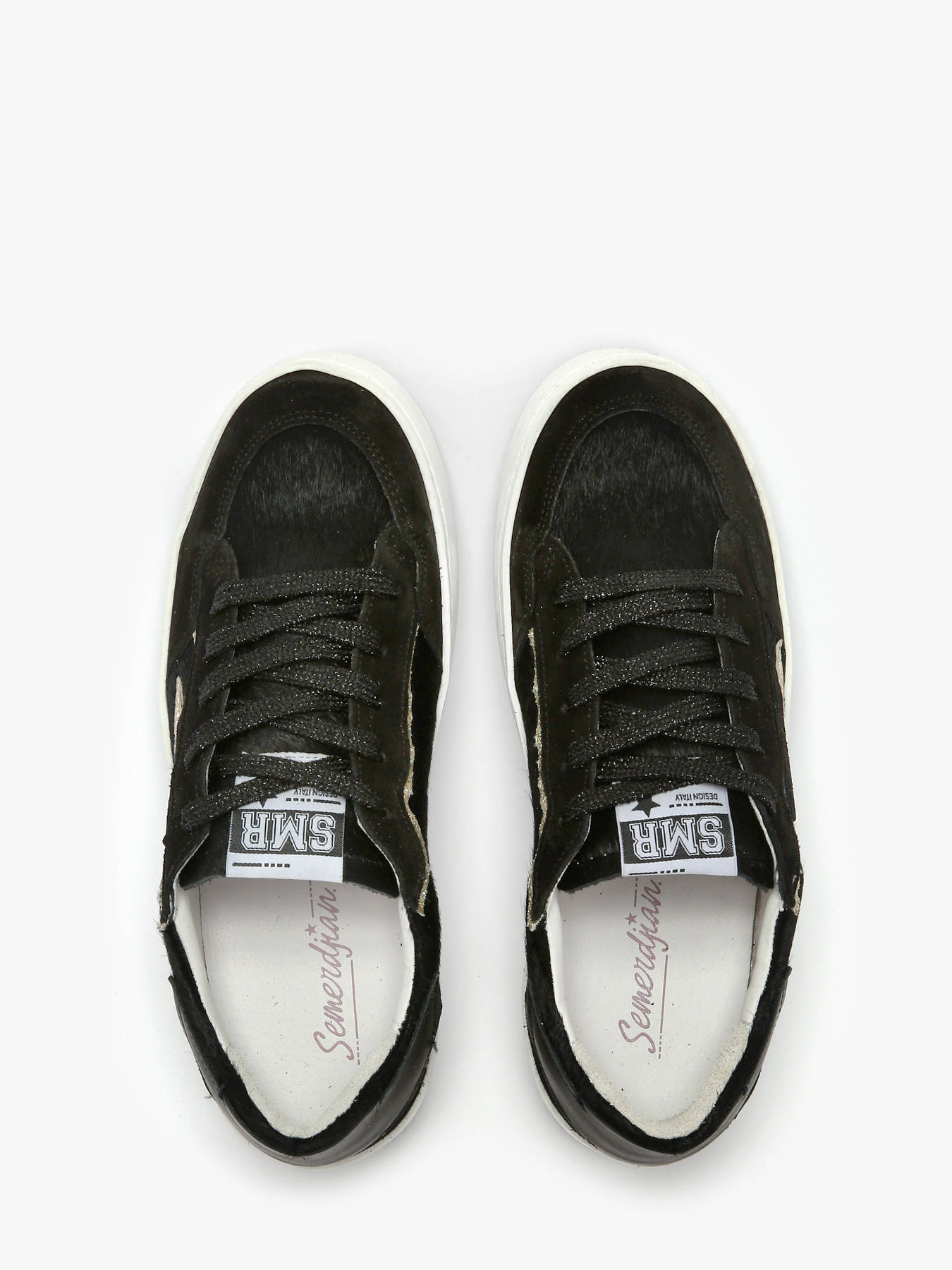 Avec leur design audacieux et raffiné, les sneakers ALE de Semerdjian sont une véritable déclaration de style. Leur dessus en cuir noir est rehaussé par une étoile satinée emblématique, apportant une touche élégante et subtilement brillante. Les lacets pailletés ajoutent une note glamour et originale, idéale pour celles qui aiment se démarquer. L’intérieur en cuir et synthétique offre un confort premium, tandis que la semelle intérieure en cuir, amovible, permet un ajustement personnalisé. Fermées par lacets, elles allient parfaitement style et fonctionnalité. Que ce soit pour une tenue casual chic ou un look plus audacieux, ces sneakers incarnent l’esprit tendance et affirmé de la marque Semerdjian.